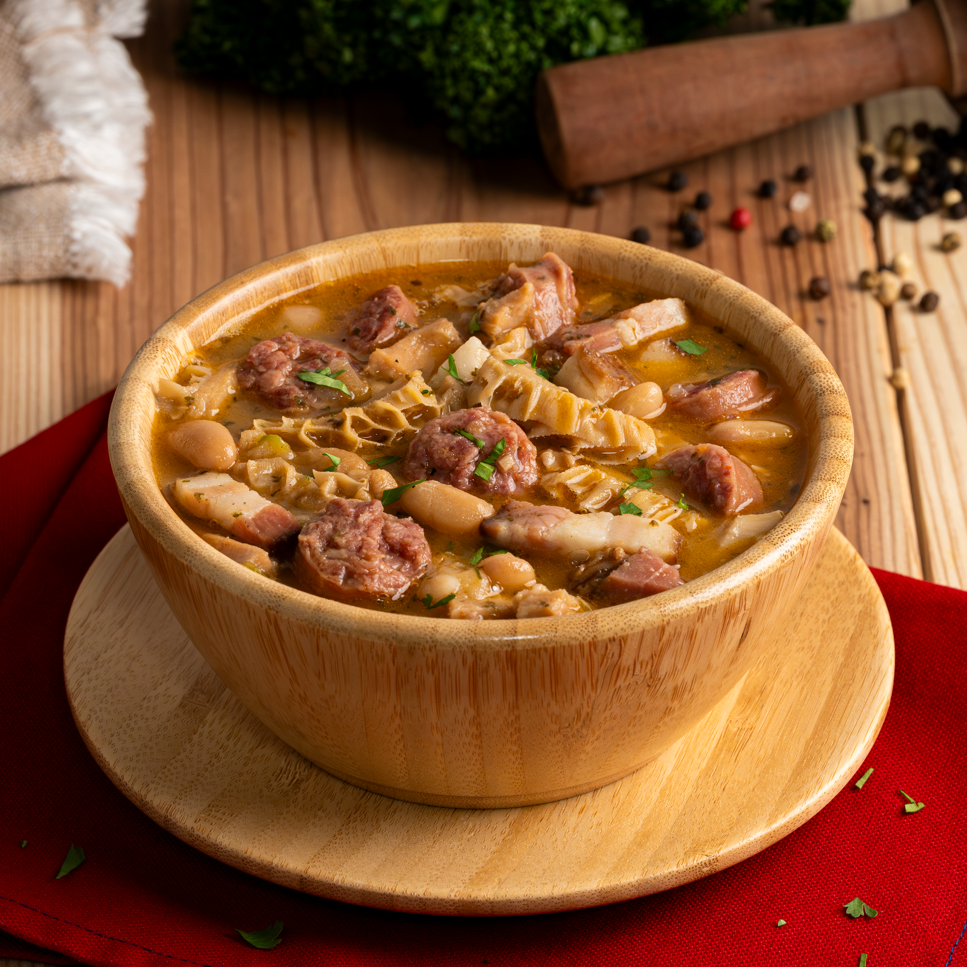A Dobradinha com Feijão Branco da Bá Foods é uma refeição completa e reconfortante, preparada com bucho macio, bacon e calabresa selecionados, combinados com o toque especial dos nossos temperos caseiros e feijão branco cozido no ponto certo. Um prato clássico da culinária brasileira, ideal para quem busca praticidade sem abrir mão do sabor de casa.