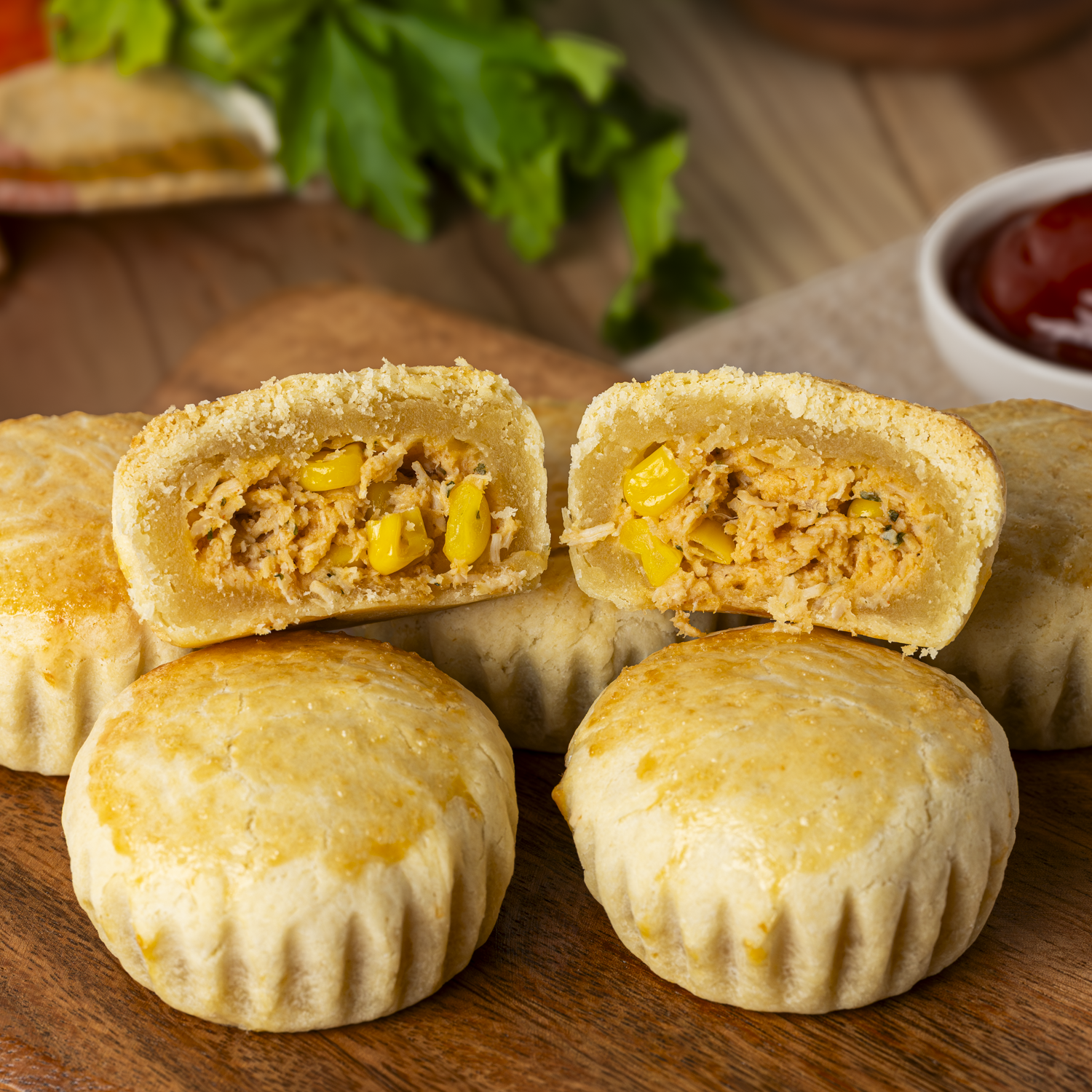 A empada de frango da Bá é feita com massa amanteigada e recheio de frango desfiado no tempero de casa.