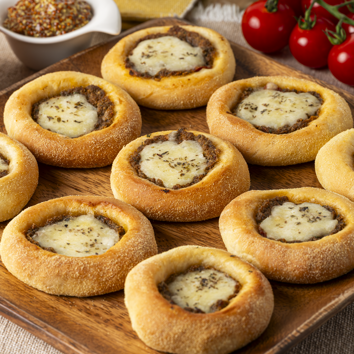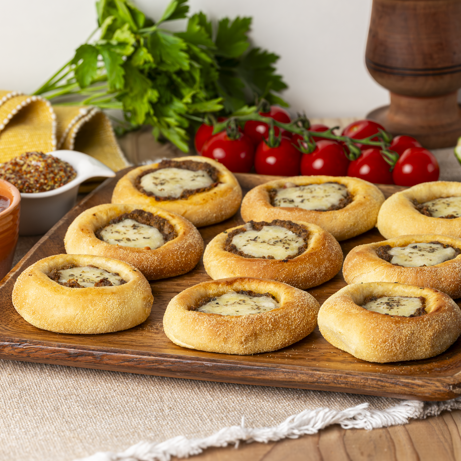 Com massa macia e levemente dourada, a esfiha aberta da Bá é recheada com carne moída temperada com cebola, tomate e especiarias.
