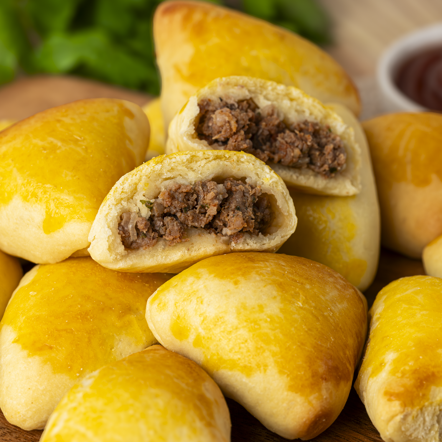 Nossa esfiha fechada tem massa macia e recheio de carne moída temperada com cebola, tomate e especiarias, do jeitinho brasileiro que todo mundo ama.